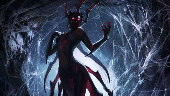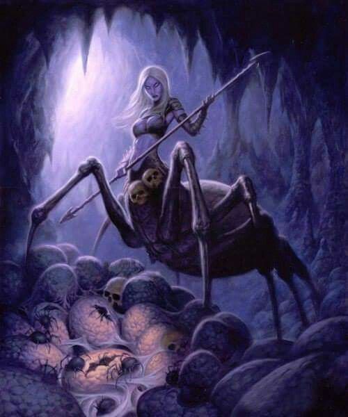 | Physical Description | She had two forms the first of which is that of a small well toned woman with skin the color of black ink. All four of her canines are elongated and the rest of her teeth are sharper than normal. Her nails like her eyes look to be made of a crimson gem that can be extended and retracted. Her ears are long and pointed. In her other form which for sometime was how she looked for many years, Stryde was half from the waist up the woman described before and below that the body of a massive black widow spider. |